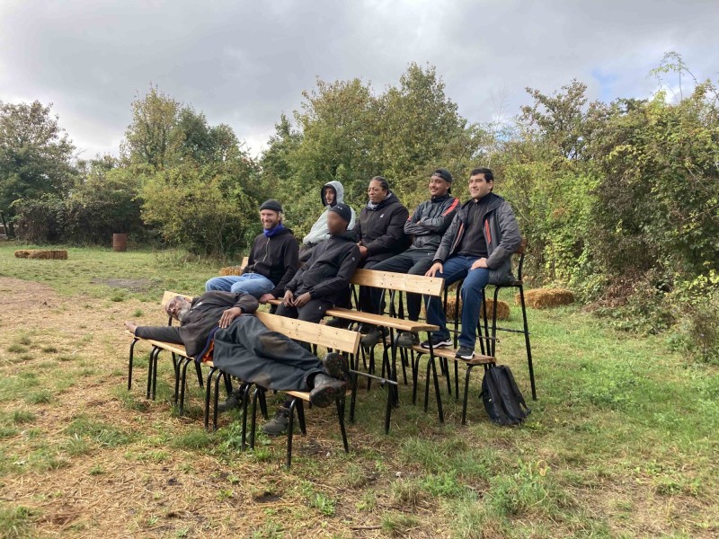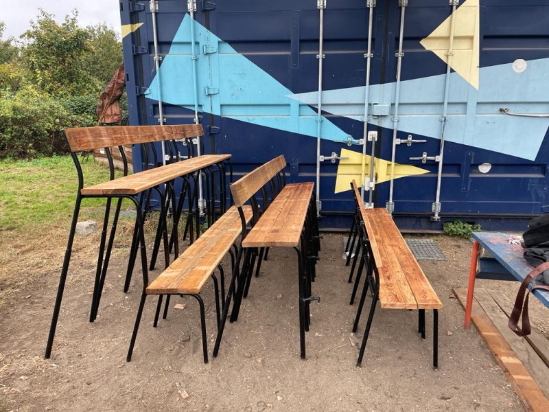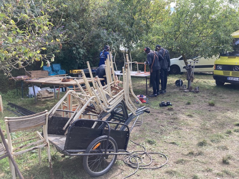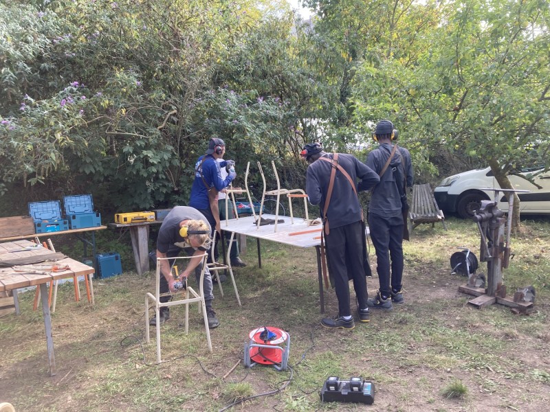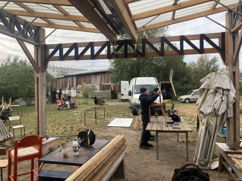 L'équipe a réalisé des gradins qui serviront pour les événements qui ont lieu sur l'espace commun de la Prairie dans les Murs à Pêches à Montreuil. Ils ont été réalisés à partir de bois de réemploi et d'anciennes chaises d'école en métal. La partie menuiserie a été encadrée par @Victor Trosset et la partie métal (soudure et forge) a été encadrée par David, de l'association Forge et Itinérance.