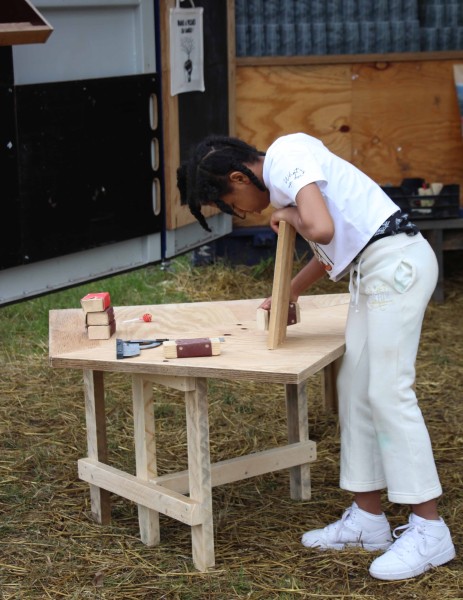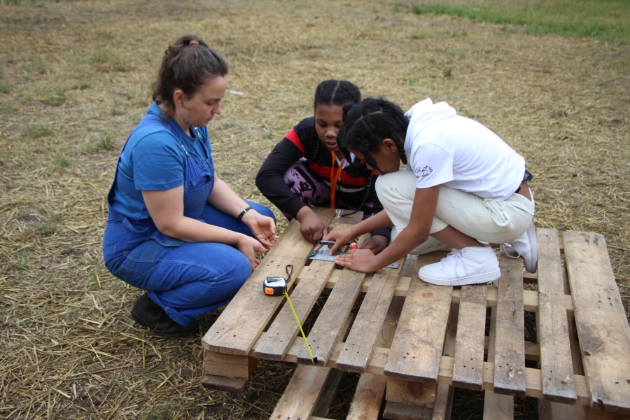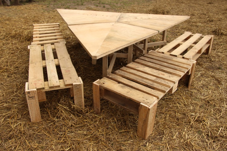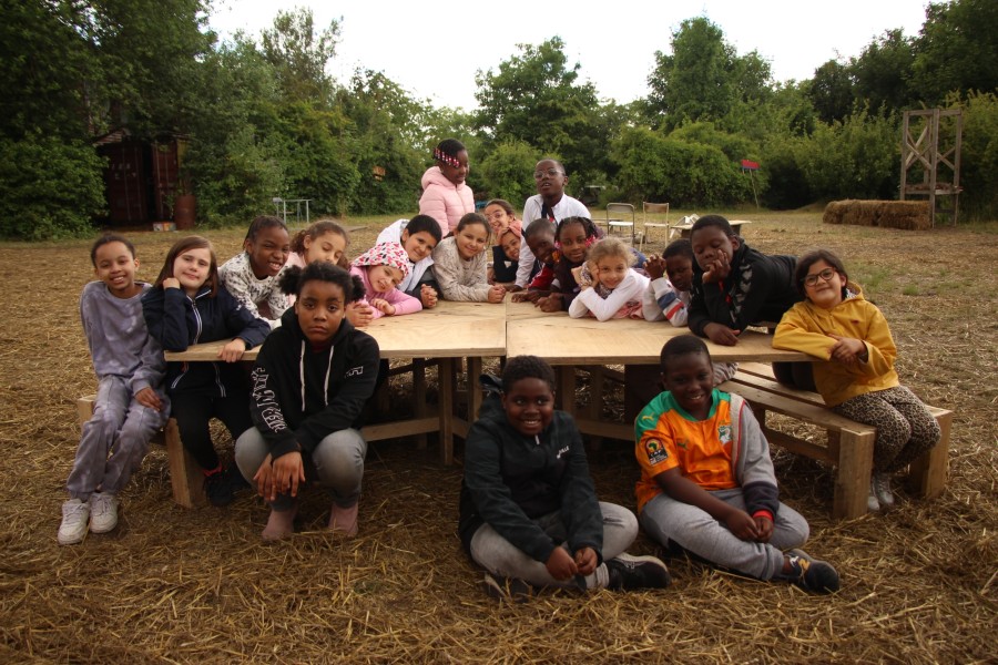 Sur la Prairie, durant deux journées et demie, d’abord sous la pluie puis sous un soleil de plomb, nous avons animé des ateliers avec une centaine d’élèves du CE2 au CM2, une dizaine de professeurs et parents d’élèves. Finalement, 4 bancs en palettes et 3 tables géométriques s’imbriquant pour former une grande table triangulaire ont été fabriqués. Ces enfants du quartier Bel Air, familiers pour la plupart des Murs à Pêches - qu’ils sont d’ailleurs partis explorer - ont pu s’essayer aux différents gestes de la menuiserie : mesurer, tracer, scier, percer, visser, poncer... Nous attendons maintenant les photos du mobilier peint par les élèves de CP !
