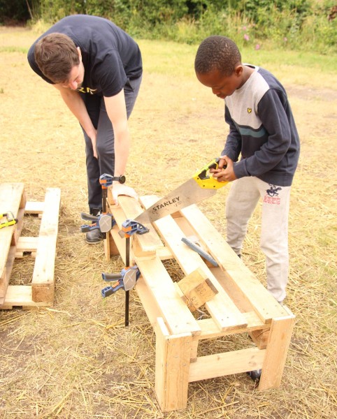 Plusieurs idées ont émergé de ces temps de conception collective, comme l’idée de fabriquer des pieds (imperméables!) en bouteille en plastique. Finalement, pneus et bouteilles ont été abandonnés au profit d’un mobilier tout en bois, dont la fabrication permettrait aux plus grands de s’initier au travail du bois, et aux plus petits de peindre.