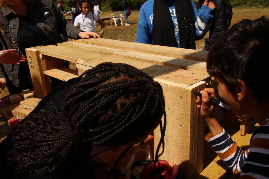 A partir des matériaux de récupération disponibles (trouvés à l’école et sur la parcelle de la Prairie), - des vieux pneus, des palettes et des planches de contreplaqué -, les élèves et leurs professeurs ont travaillé sur des dessins et des maquettes.