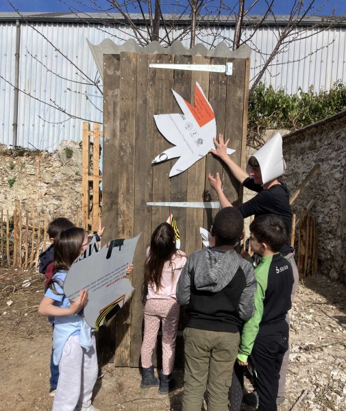L'atelier décoration consiste à faire une première visite de la parcelle, puis à aller regarder plus attentivement la flore locale. Les élèves choisissent des feuilles ou des végétaux, puis après les avoir nommés, les dessinent en grand format sur des feuilles de papier. Ces dessins sont découpés par les élèves pour fabriquer des patrons, qui sont positionnés avec elleux sur les façades des toilettes sèches afin de former une frise.