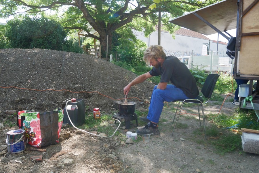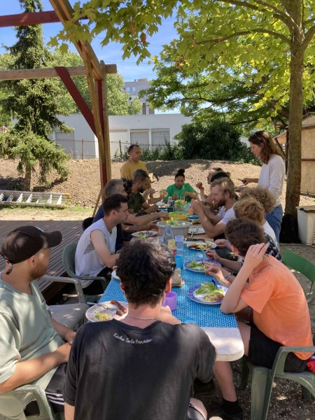 En juin 2021, nous avons organisé la mise en place d’un chantier participatif, qui a mobilisé des bénévoles de l’association, trois jeunes en partenariat avec la mission locale de Montreuil, et des élèves d’une classe de CM1 de l’école primaire Joliot Curie. Aline s'est chargé de la mise en place de ces différents partenariats, et a coordonné les repas du midi en apportant la cuisine mobile de Récolte Urbaine (voir projet Cuisine Mobile) sur le chantier.