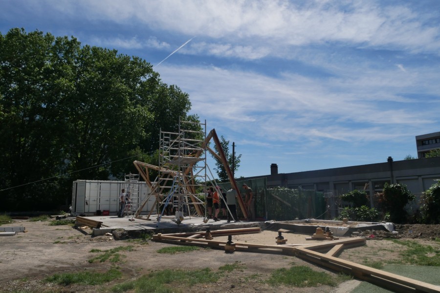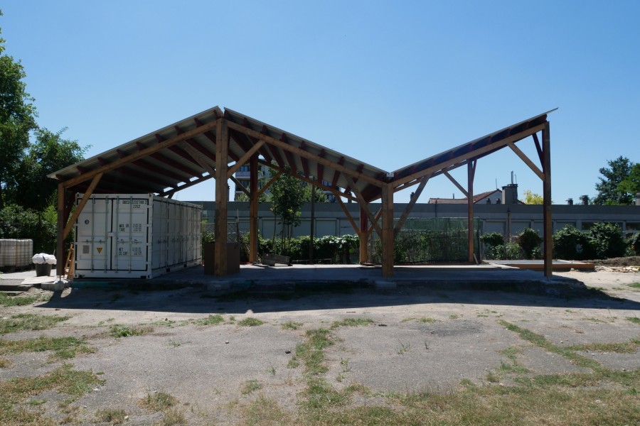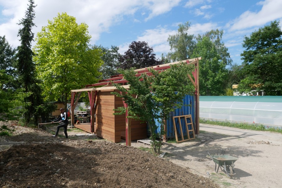 La plupart des éléments de charpente sont issus du réemploi, récupérés sur un chantier de démolition de bâtiments à Saint-Denis. Les éléments de charpente récupérés sont laissés bruts. Les éléments achetés en complément sont peints en rouge avec une peinture suédoise (à base de farine) préparée sur place. Les fermes de la charpente d'origine sont réagencées pour donner du mouvement à la nouvelle structure. Le bois de terrasse et de bardage est entièrement issu du réemploi (erreurs de commandes données par un négociant bois).