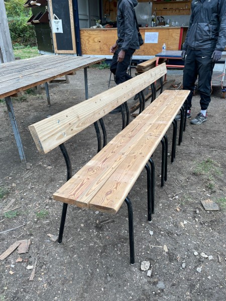 L'équipe a réalisé des gradins qui serviront pour les événements qui ont lieu sur l'espace commun de la Prairie dans les Murs à Pêches à Montreuil. Ils ont été réalisés à partir de bois de réemploi et d'anciennes chaises d'école en métal. La partie menuiserie a été encadrée par @Victor Trosset et la partie métal (soudure et forge) a été encadrée par David, de l'association Forge et Itinérance.