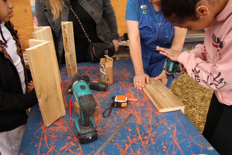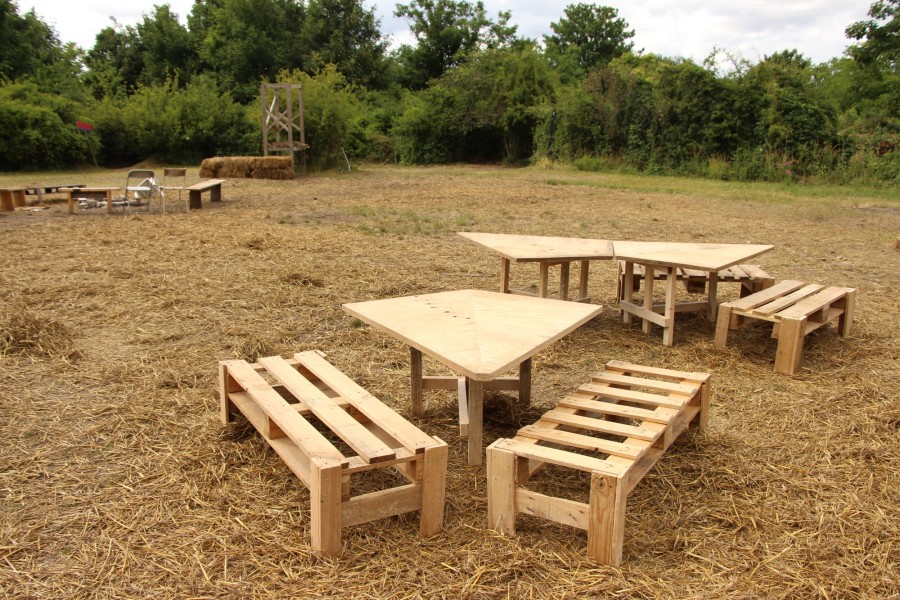 Sur la Prairie, durant deux journées et demie, d’abord sous la pluie puis sous un soleil de plomb, nous avons animé des ateliers avec une centaine d’élèves du CE2 au CM2, une dizaine de professeurs et parents d’élèves. Finalement, 4 bancs en palettes et 3 tables géométriques s’imbriquant pour former une grande table triangulaire ont été fabriqués. Ces enfants du quartier Bel Air, familiers pour la plupart des Murs à Pêches - qu’ils sont d’ailleurs partis explorer - ont pu s’essayer aux différents gestes de la menuiserie : mesurer, tracer, scier, percer, visser, poncer... Nous attendons maintenant les photos du mobilier peint par les élèves de CP !
