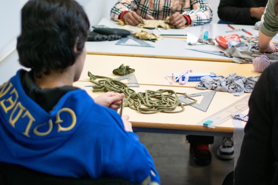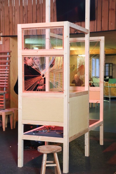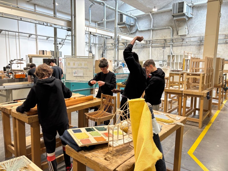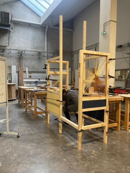 Pour construire ce confident, nous avons eu recours à des techniques de menuiserie, que les élèves apprennent à maîtriser, mais aussi à des techniques textiles, nouvelles pour elleux. Nous avons ainsi exploré la gainerie-tapisserie et le tissage.