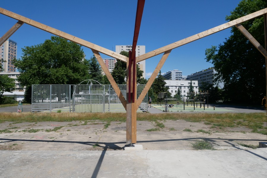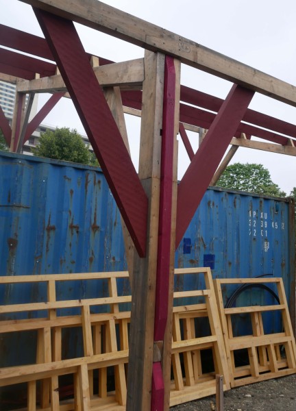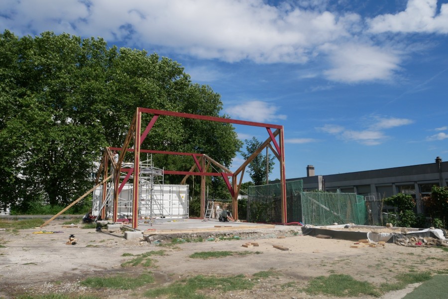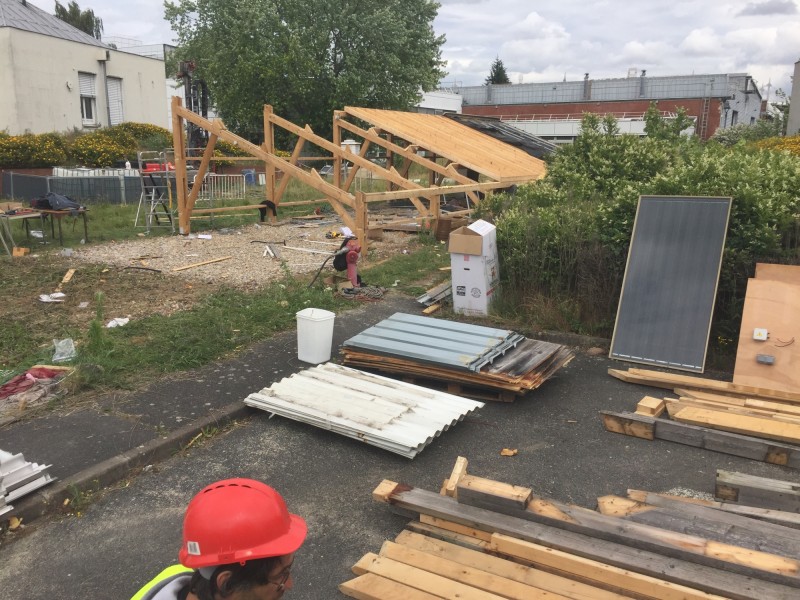 La plupart des éléments de charpente sont issus du réemploi, récupérés sur un chantier de démolition de bâtiments à Saint-Denis. Les éléments de charpente récupérés sont laissés bruts. Les éléments achetés en complément sont peints en rouge avec une peinture suédoise (à base de farine) préparée sur place. Les fermes de la charpente d'origine sont réagencées pour donner du mouvement à la nouvelle structure. Le bois de terrasse et de bardage est entièrement issu du réemploi (erreurs de commandes données par un négociant bois).