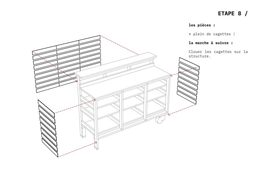 Nous avons construit en atelier la structure primaire de l’ensemble du bar à partir de contreplaqué récupéré auprès d'une entreprise du BTP. Nous avons ensuite mené plusieurs ateliers participatifs pendant les temps de marché. Les usagers du marché et de la buvette ont ainsi pu participer à l’habillage des façades des meubles, réalisé à partir de bois de cagettes récupérées directement sur le marché.