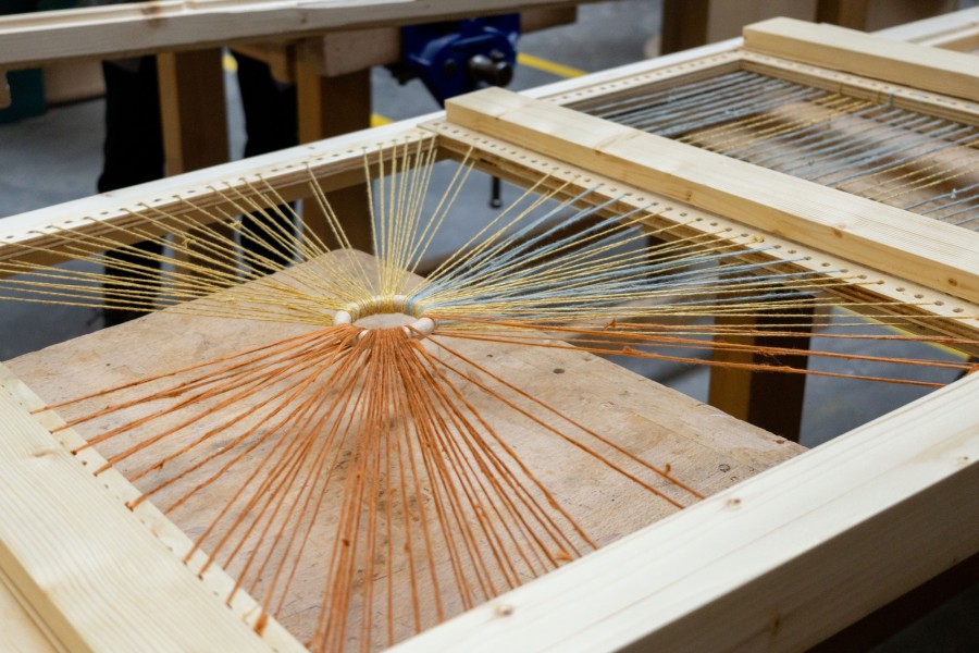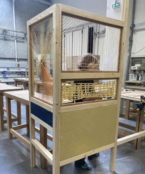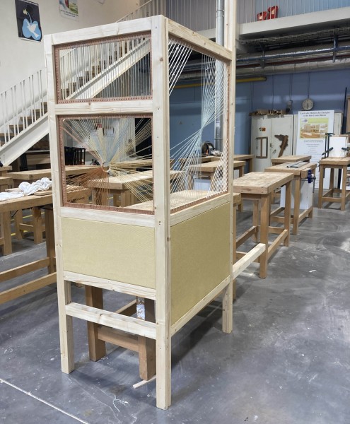 Pour construire ce confident, nous avons eu recours à des techniques de menuiserie, que les élèves apprennent à maîtriser, mais aussi à des techniques textiles, nouvelles pour elleux. Nous avons ainsi exploré la gainerie-tapisserie et le tissage.