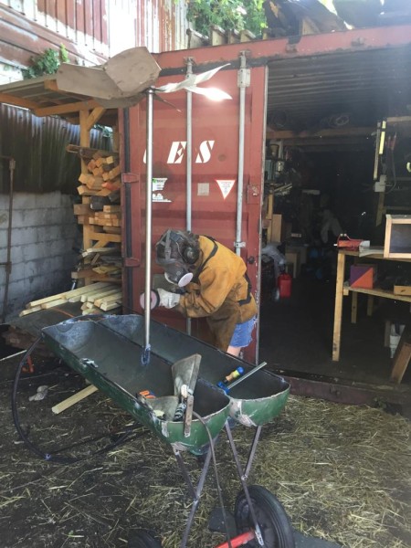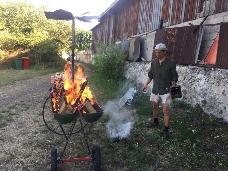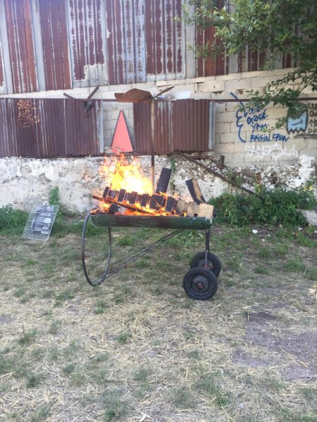 Lors d'un chantier participatif, nous avons invité les participant.e.s à venir découper, meuler et souder la carcasse d'une bonbonne de gaz pour créer le barbecue. Une hélice qui tournera lors des grandes flambées a été ajoutée en haut de la structure.