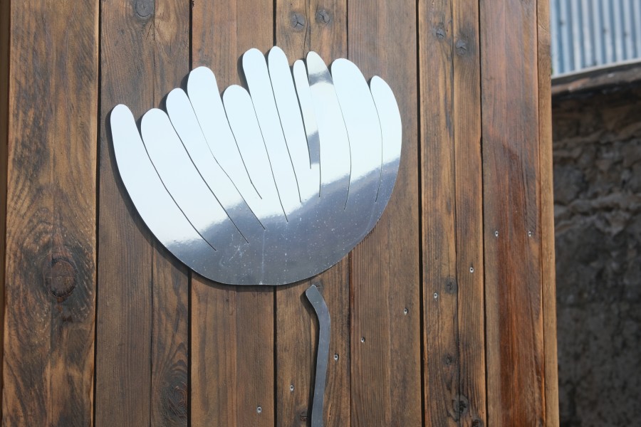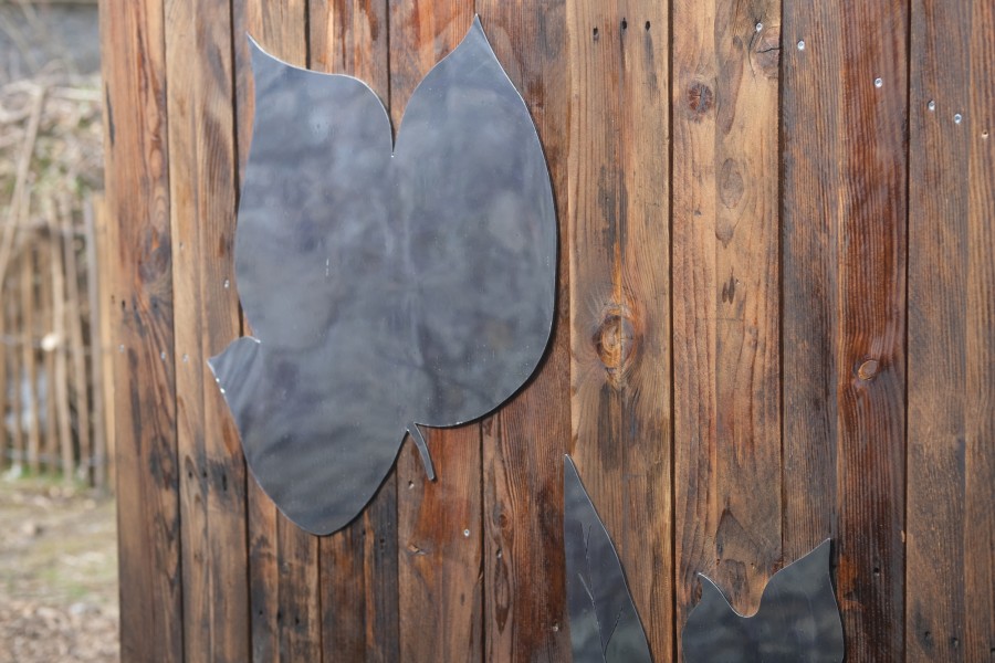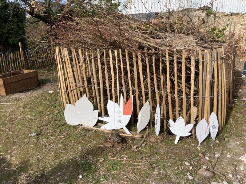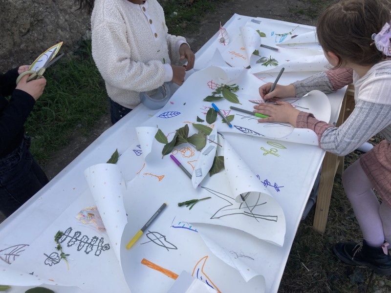 L'atelier décoration consiste à faire une première visite de la parcelle, puis à aller regarder plus attentivement la flore locale. Les élèves choisissent des feuilles ou des végétaux, puis après les avoir nommés, les dessinent en grand format sur des feuilles de papier. Ces dessins sont découpés par les élèves pour fabriquer des patrons, qui sont positionnés avec elleux sur les façades des toilettes sèches afin de former une frise.