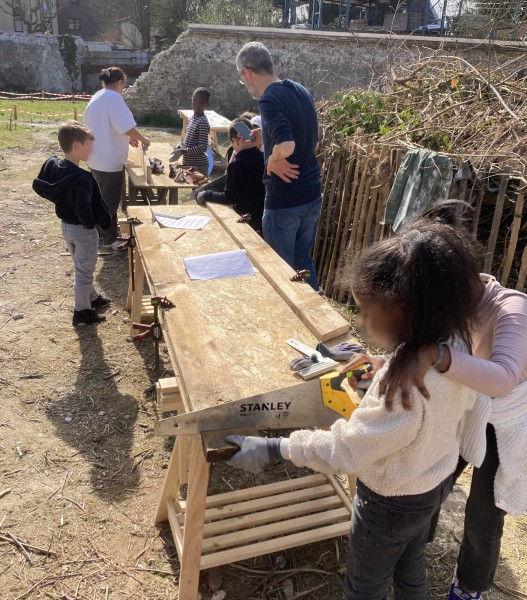 Nous construisons en amont l'ossature principale des toilettes ainsi que l'assise intérieure. Lors de deux journées d’ateliers, nous recevons ensuite une classe de l'école Estienne d'Orves ainsi que deux classes de l'école Danton, afin de réaliser le bardage bois et la décoration des toilettes.
