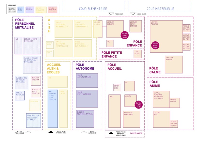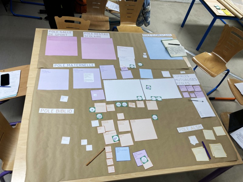 Pour adresser l'enjeu de forte mutualisation des espaces qui va caractériser cette médiathèque, nous avons travaillé à la fois avec des directeur.ices de groupes scolaires et de périscolaire, des médiathécaires et des associations de la ville.